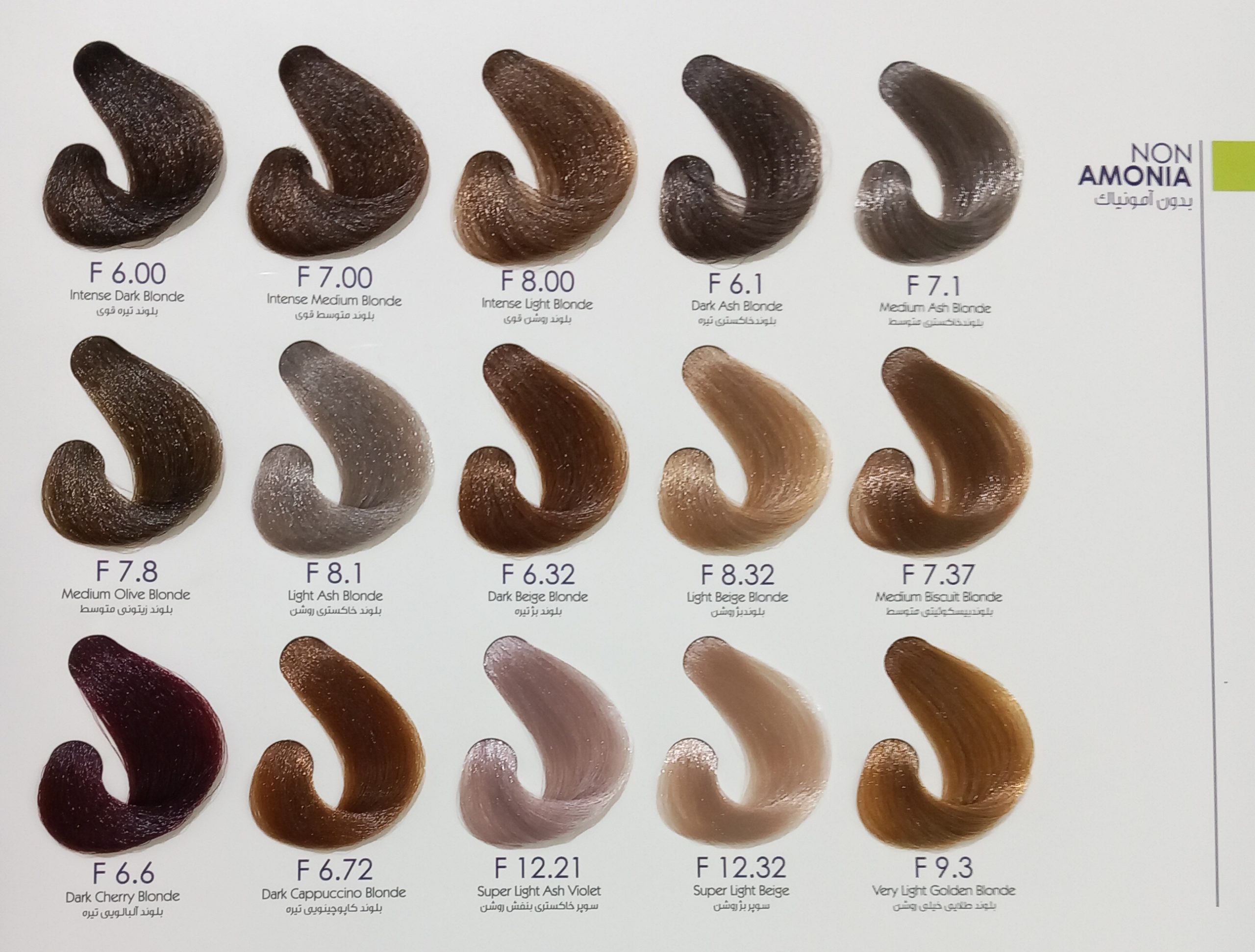 | رنگ | F 12.21 سوپر خاکستری بنفش روشن بن هیر ,F 12.32 سوپر بژ روشن بن هیر ,F 6.00 بلوند تیره قوی بن هیر ,F 6.1 بلوند خاکستری تیره بن هیر ,F 6.32 بلوندبژ تیره بن هیر ,F 6.6 بلوند آلبالویی تیره بن هیر ,F 6.72 بلوند کاپوچینویی تیره بن هیر ,F 7.00 بلوند متوسط قوی بن هیر ,F 7.1 بلوند خاکستری متوسط بن هیر ,F 7.37 بلوندبیسکوییتی متوسط بن هیر ,F 7.8 بلوند زیتونی متوسط بن هیر ,F 8.00 بلوند روشن قوی بن هیر ,F 8.1 بلوندخاکستری روشن بن هیر ,F 8.32 بلوندبژروشن بن هیر ,F 9.3 بلوند طلایی خیلی روشن بن هیر |