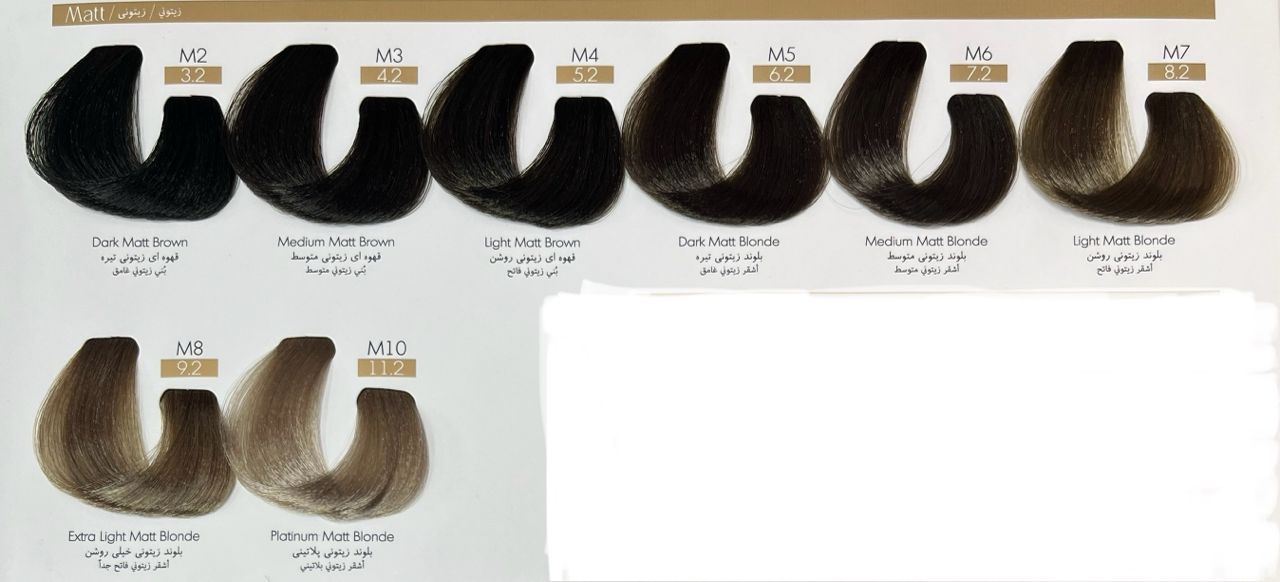 | رنگ | 5.2:قهوه ای زیتونی روشن ,6.2:بلوندزیتونی تیره ,8.2;بلوندزیتونی روشن ,9.2:بلوندزیتونی خیلی روشن ,11.2بلوند زیتونی پلاتینی ,3.2قهوه ای زیتونی تیره ,4.2 قهوه ای زیتونی متوسط ,7.2بلوند زیتونی متوسط |