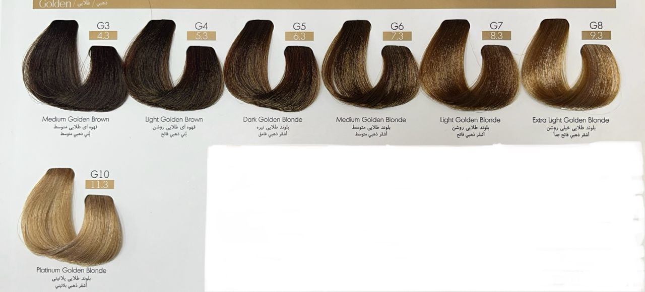 | رنگ | 8.3:بلوندطلایی روشن ,11.3بلوند طلایی پلاتینی ,4.3قهوه ای طلایی متوسط ,5.3 قهوه ای طلایی روشن ,6.3بلوند طلایی تیره ,7.3بلوند طلایی متوسط ,9.3بلوند طلایی خیلی روشن |