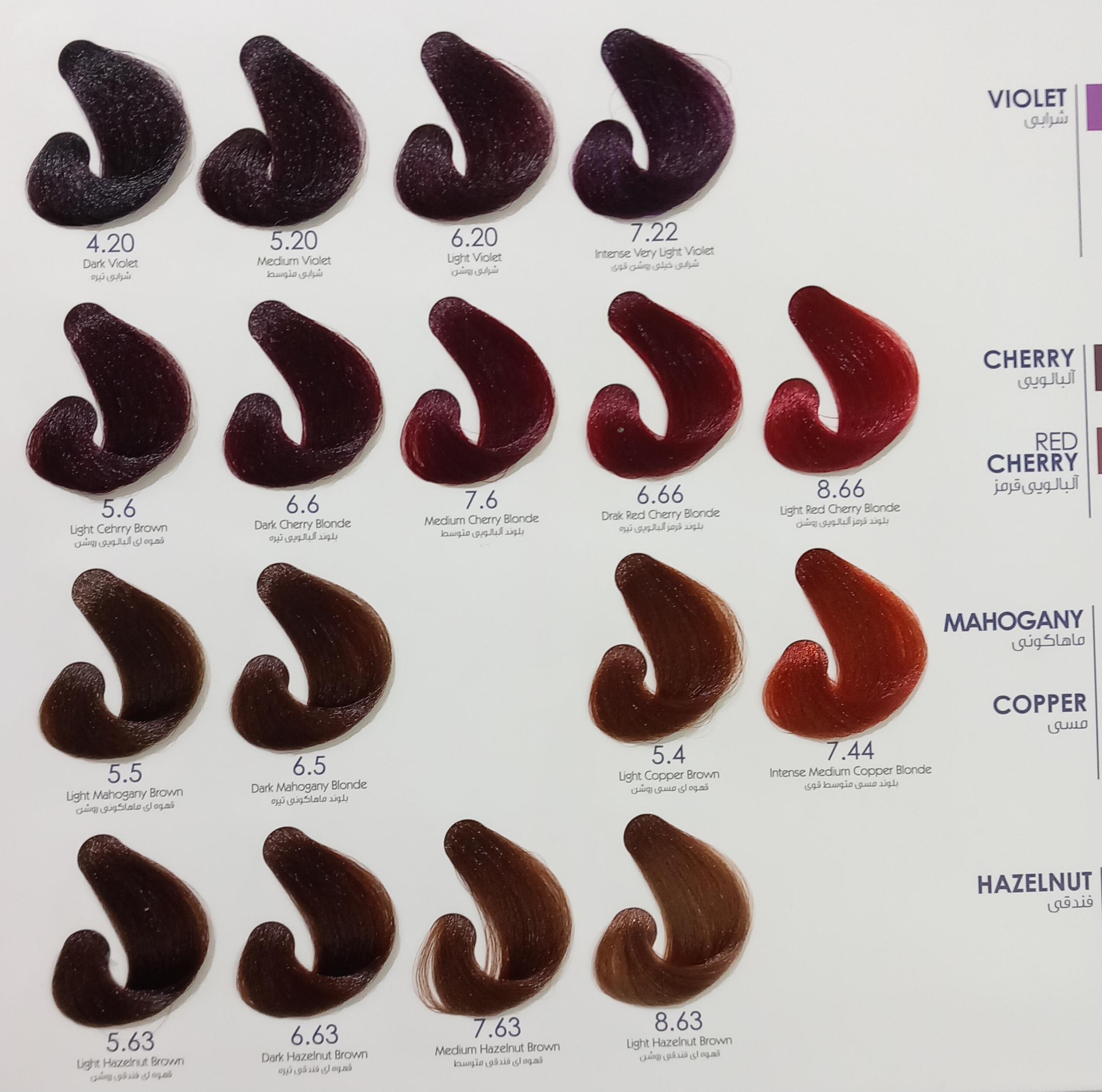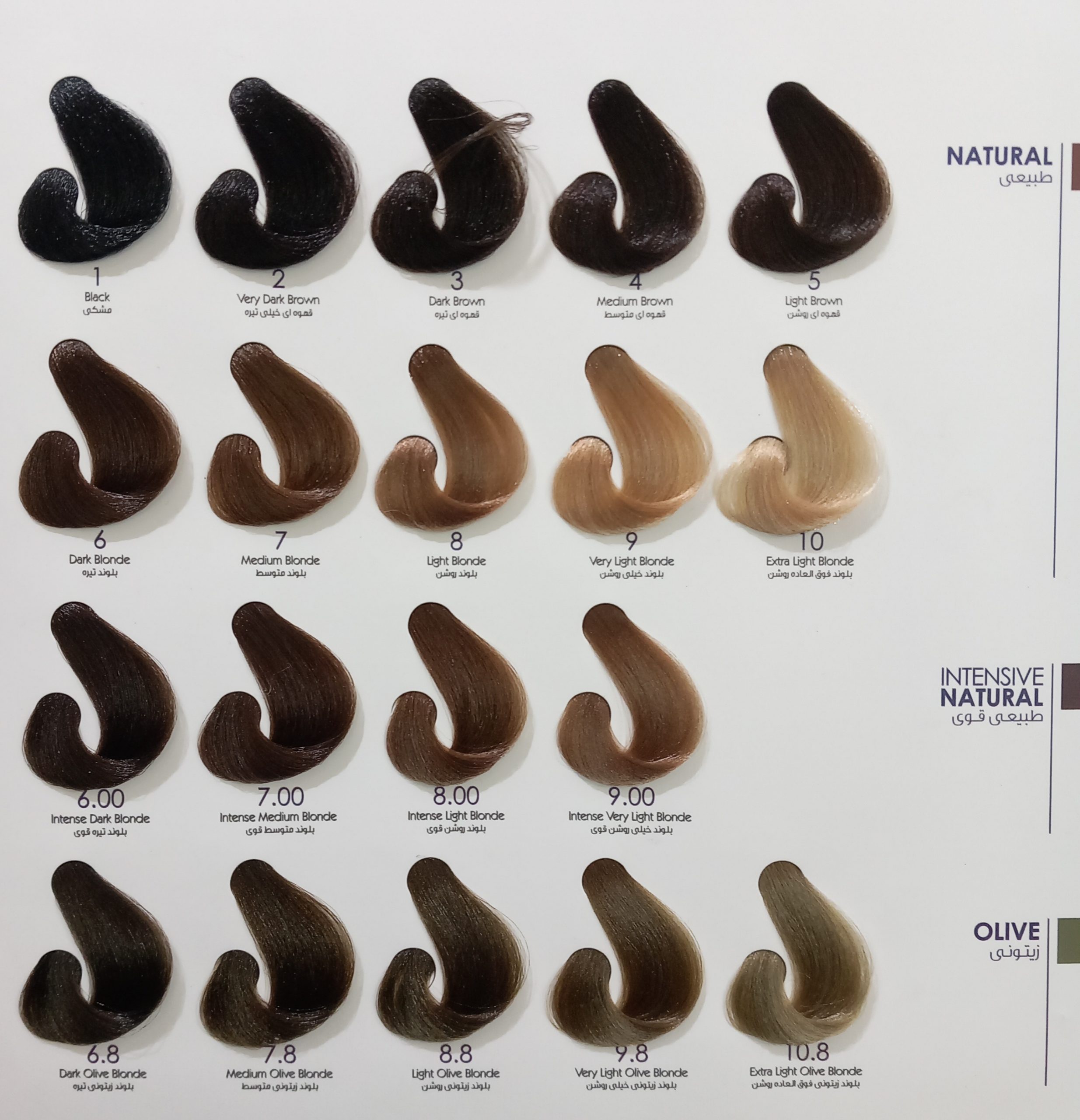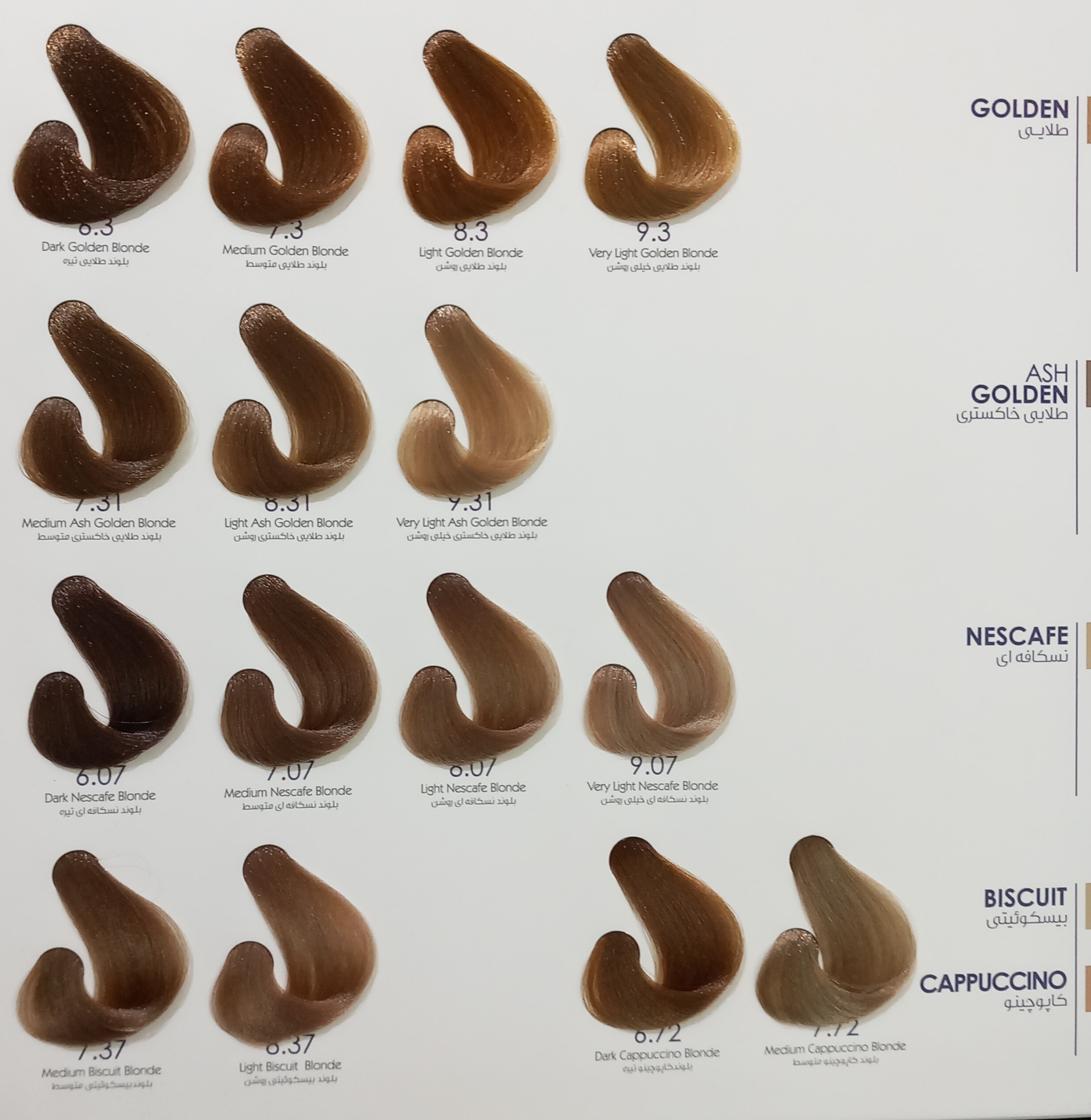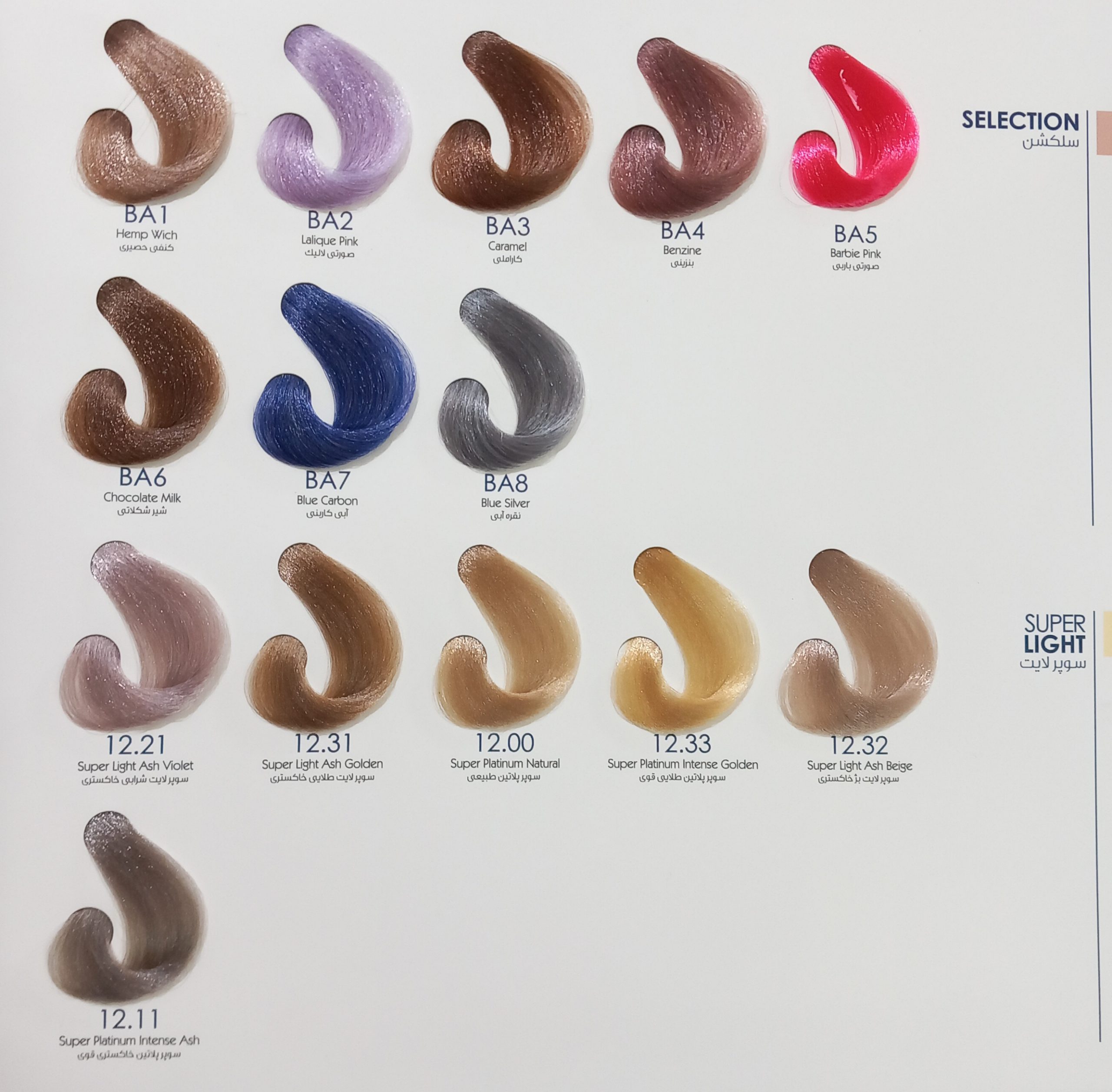 | رنگ | 1 مشکی بن هیر ,1.1 مشکی پر کلاغی بن هیر ,10 بلوندفوق العاده روشن بن هیر ,10.1 بلوند خاکستری فوق العاده روشن بن هیر ,10.8 بلوند زیتونی فوق العاده روشن بن هیر ,12.00 سوپر پلاتین طبیعی بن هیر ,12.11 سوپر پلاتین خاکستری قوی بن هیر ,12.21 سوپر لایت شرابی خاکستری بن هیر ,12.31 سوپر لایت طلایی خاکستری بن هیر ,12.32 سوپر لایت بژ خاکستری بن هیر ,12.33 سوپر پلاتین طلایی قوی بن هیر ,2 BA صورتی لالیک بن هیر ,2 قهوه ای خیلی تیره بن هیر ,3 BA کاراملی بن هیر ,3 قهوه ای تیره بن هیر ,4 BA بنزینی بن هیر ,4 قهوه ای متوسط بن هیر ,4.20 شرابی تیره بن هیر ,5 BA صورتی باربی بن هیر ,5 قهوه ای روشن بن هیر ,5.1 قهوه ای خاکستری روشن بن هیر ,5.20 شرابی متوسط بن هیر ,5.4قهوه ای مسی روشن بن هیر ,5.5 قهوه ای ماهاگونی روشن بن هیر ,5.63 قهوه ای فندقی روشن بن هیر ,5.6قهوه ای آلبالویی روشن بن هیر ,6 BA شیر شکلاتی بن هیر ,6 بلوند تیره بن هیر ,6.00 بلوند تیره قوی بن هیر ,6.07بلوند نسکافه ای تیره بن هیر ,6.1 بلوند خاکستری تیره بن هیر ,6.11 بلوند خاکستری تیره قوی بن هیر ,6.20 شرابی روشن بن هیر ,6.3 بلوند طلایی تیره بن هیر ,6.32 بلوند بژ تیره بن هیر ,6.5 بلوند ماهاگونی تیره بن هیر ,6.63 قهوه ای فندقی تیره بن هیر ,6.66بلوند قزمز آلبالویی تیره بن هیر ,6.6بلوند آلبالویی تیره بن هیر ,6.72 بلوند کاپوچینو تیره بن هیر ,6.8 بلوند زیتونی تیره بن هیر ,7 BA آبی کاربنی بن هیر ,7 بلوند متوسط بن هیر ,7.00 بلوندمتوسط قوی بن هیر ,7.07بلوند نسکافه ای متوسط بن هیر ,7.1 بلوند خاکستری متوسط بن هیر ,7.11 بلوند خاکستری متوسط قوی بن هیر ,7.22 شرابی خیلی روشن قوی بن هیر ,7.3 بلوند طلایی متوسط بن هیر ,7.31بلوند طلایی خاکستری متوسط بن هیر ,7.32 بلوند بژمتوسط بن هیر ,7.37 بلوند بیسکوییتی متوسط بن هیر ,7.44 بلوند مسی متوسط قوی بن هیر ,7.63 قهوه ای فندقی متوسط بن هیر ,7.6بلوند آلبالویی متوسط بن هیر ,7.72 بلوند کاپوچینو متوسط بن هیر ,7.8 بلوند زیتونی متوسط بن هیر ,8 BA نقره آبی بن هیر ,8 بلوند روشن بن هیر ,8.00 بلوندروشن قوی بن هیر ,8.07بلوند نسکافه ای روشن بن هیر ,8.1 بلوند خاکستری روشن بن هیر ,8.11 بلوند خاکستری روشن قوی بن هیر ,8.3 بلوند طلایی روشن بن هیر ,8.31بلوند طلایی خاکستری روشن بن هیر ,8.32 بلوند بژ روشن بن هیر ,8.37 بلوند بیسکوییتی روشن بن هیر ,8.63 قهوه ای فندقی روشن بن هیر ,8.66بلوند قزمز آلبالویی روشن بن هیر ,8.8 بلوند زیتونی روشن بن هیر ,9 بلوند خیلی روشن بن هیر ,9.00 بلوند خیلی روشن قوی بن هیر ,9.07بلوند نسکافه ای خیلی روشن بن هیر ,9.1 بلوند خاکستری خیلی روشن بن هیر ,9.11 بلوند خاکستری خیلی روشن قوی بن هیر ,9.31بلوند طلایی خاکستری خیلی روشن بن هیر ,9.32 بلوند بژ خیلی روشن بن هیر ,9.3بلوند طلایی خیلی روشن بن هیر ,9.8 بلوند زیتونی خیلی روشن بن هیر ,BA 1 کنفی حصیری بن هیر |