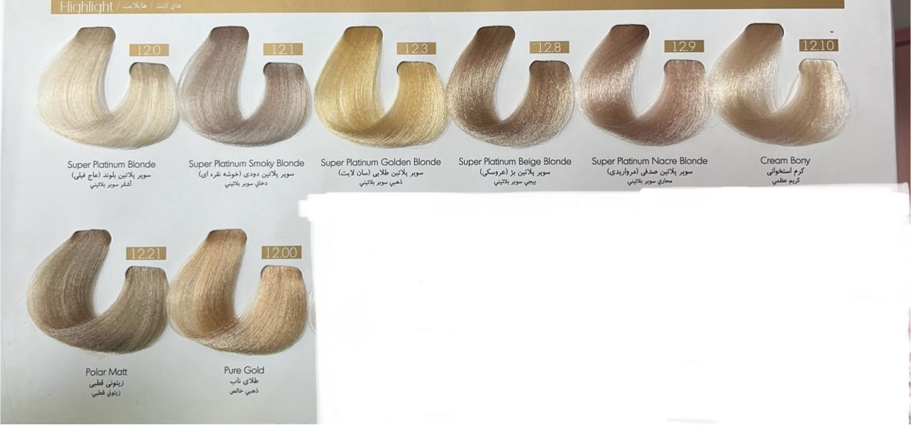 | رنگ | 12.00طلای ناب ,12.0سوپر پلاتین بلوند(عاج فیلی) ,12.10کرم استخوانی ,12.1سوپر پلاتین دودی (خوشه نقره ای) ,12.21زیتونی قطبی ,12.3سوپر پلاتین طلایی(سان لایت) ,12.8سوپر پلاتین بژ(عروسکی) ,12.9سوپر پلاتین صدفی(مرواریدی) |