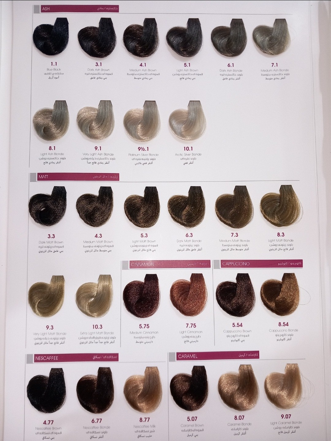 | رنگ | 000روشن کننده نیوفایو ,001واریاسیون آبی نیوفایو ,002واریاسیون سبز نیوفایو ,003واریاسیون دودی نیوفایو ,004واریاسیون نقره ای نیوفایو ,005واریاسیون بنفش نیوفایو ,006واریاسیون قرمز نیوفایو ,007واریاسیون زرد نیوفایو ,1.(1/2)9بلوند پلاتینه نقره ای نیوفایو ,1.1مشکی پرکلاغی نیوفایو ,10.00بلوندپلاتینه طبیعی قوی نیوفایو ,10.1بلوند نقره ای نیوفایو ,10.2بلوند دودی خیلی خیلی روشن نیوفایو ,10.31بلوند بژ فوق روشن نیوفایو ,10.3بلوند زیتونی فوق روشن نیوفایو ,10بلوند فوق روشن نیوفایو ,1مشکی نیوفایو ,2قهوه ای خیلی تیره نیوفایو ,3.00 قهوه تیره طبیعی قوی نیوفایو ,3.1 قهوه ای خاکستری تیره نیوفایو ,3.2قهوه ای دودی تیره نیوفایو ,3.3قهوه ای زیتونی تیره نیوفایو ,3.5قهوه ای طلایی تیره نیوفایو ,3قهوه ای تیره نیوفایو ,4.00قهوه متوسط قوی نیوفایو ,4.1قهوه ای خاکستری متوسط نیوفایو ,4.20 شرابی تیره نیوفایو ,4.2قهوه ای دودی متوسط نیوفایو ,4.3قهوه ای زیتونی متوسط نیوفایو ,4.53قهوه ای کاکائوی متوسط نیوفایو ,4.5قهوه ای طلایی متوسط نیوفایو ,4.62بلوطی قرمز تیره نیوفایو ,4.65قهوه ای تنباکویی متوسط نیوفایو ,4.77 قهوه ای نسکافه ای نیوفایو ,4NCقهوه ای طبیعی خاکستری نیوفایو ,4قهوه ای متوسط نیوفایو ,5.(1/2)9بلوند طلایی فوق روشن نیوفایو ,5.00قهوه روشن طبیعی قوی نیوفایو ,5.07قهوه ای کاراملی نیوفایو ,5.1قهوه ای خاکستری روشن نیوفایو ,5.20 شرابی متوسط نیوفایو ,5.2قهوه ای دودی روشن نیوفایو ,5.3قهوه ای زیتونی روشن نیوفایو ,5.4قهوه ای مسی روشن نیوفایو ,5.53قهوه ای کاکائوی روشن نیوفایو ,5.54قهوه ای کاپوچینو نیوفایو ,5.55آلبالویی تیره نیوفایو ,5.5قهوه ای طلایی روشن نیو فایو ,5.62بلوطی قرمزمتوسط نیوفایو ,5.65قهوه ای تنباکویی روشن نیوقایو ,5.75دارچینی متوسط نیوفایو ,5NCقهوه ای طبیعی خاکستری روشن نیوفایو ,5قهوه ای زوشن نیوفایو ,6.00بلوند تیره طبیعی قوی نیوفایو ,6.15 بلوند کنفی نیوفایو ,6.1بلوند خاکستری تیره نیوفایو ,6.20 شرابی روشن نیوفایو ,6.25بلوند شنی تیره نیوفایو ,6.2بلوند دودی تیره نیوفایو ,6.31بلوند بژ تیره نیوفایو ,6.3بلوند زیتونی تیره نیوفایو ,6.4بلوند مسی تیره نیوفایو ,6.53 بلوند کاکائوی تیره نیوفایو ,6.55آلبالویی نیوفایو ,6.5بلوند طلایی تیره نیوفایو ,6.64بلوند بلوط تیره نیوفایو ,6.65بلوند تنباکویی تیره نیوفایو ,6.66بلوند قرمز تیره قوی نیوفایو ,6.77بلوند نسکافه ای نیوفایو ,6NCبلوند طبیعی خاکستری تیره نیوفایو ,6بلوندتیره نیوفایو ,7.00 بلوند متوسط طبیعی قوی نیوفایو ,7.1بلوند خاکستری متوسط نیوفایو ,7.20شرابی خیلی روشن نیوفایو ,7.25بلوند شنی متوسط نیوفایو ,7.2بلوند دودی متوسط نیوفایو ,7.3 بلوند زیتونی متوسط نیوفایو ,7.31بلوند بژ متوسط نیوفایو ,7.4بلوند مسی متوسط نیوفایو ,7.5 بلوند طلایی متوسط نیوفایو ,7.53 بلوند کاکائوی متوسط نیوفایو ,7.55آلبالویی روشن نیوفایو ,7.65بلوند تنباکویی متوسط نیوفایو ,7.66بلوند قرمز متوسط قوی نیوفایو ,7.75دارچینی روشن نیوفایو ,7NCبلوند طبیعی خاکستری ,7بلوندمتوسط نیوفایو ,8.00بلوند روشن طبیعی قوی نیوفایو ,8.07بلوند کاراملی نیوفایو ,8.1بلوند خاکستری روشن نیوفایو ,8.2بلوند دودی روشن نیوفایو ,8.31بلوند بژ روشن نیوفایو ,8.3بلوند زیتونی روشن نیوفایو ,8.4بلوند مسی روشن نیوفایو ,8.53بلوند کاکائوی روشن نیوفایو ,8.54بلوند کاپوچینو نیوفایو ,8.5بلوند طلایی روشن نیوفایو ,8.65بلوند تنباکویی روشن نیوفایو ,8.77شیرنسکافه ای نیوفایو ,8بلوند روشن نیوفایو ,9.00 بلوندخیلی روشن طبیعی قوی نیوفایو ,9.07بلوند کاراملی روشن نیوفایو ,9.15بلوند کنفی خیلی روشن نیوفایو ,9.1بلوند خاکستری خیلی روشن نیوفایو ,9.25بلوند شنی خیلی روشن نیوفایو ,9.2بلوند دودی خیلی روشن نیوفایو ,9.31بلوند بژ خیلی روشن نیوفایو ,9.3بلوند زیتونی خیلی روشن نیوفایو ,9.5بلوند طلایی خیلی روشن نیوفایو ,90.01نقره ای نیوفایو ,90.02 صدفی نیوفایو ,90.32 بژ طلایی نیوفایو ,900بلوند فوق العاده روشن نیوفایو ,901 بلوند فوق العاده روشن نیوفایو ,902بلوند فوق العاده روشن دودی نیوفایو ,903بلوند فوق العاده روشن طلایی نیوفایو ,911نقره ای خاکستر