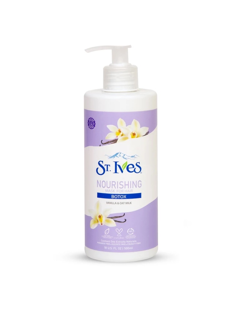 ماسک مو داخل حمام اس تی.ایوز مدل NOURISHING سری BOTOX ماسک مو داخل حمام( با آبکشی)، فری سولفات و پارابن از برند ST.Ives در سری نورشینگ(تغذیه کننده) بوده که از مواد بوتاکس استفاده شده است. مواد بوتاکس مو حاوی روغن خاویار، ویتامین B5، ویتامین E و کلاژن است. وظیفه اصلی بوتاکسِ مو، مرطوب کردن، تغذیه کردن، ترمیم و احیای مو و بازگردانی آن به حالت اول است. علاوه بر آن، استفاده از این محصول، مو ها را براق می کند و باعث صافی مو و از بین بردن وز آن می شود. مزیت اصلی استفاده از بوتاکس این است که به وسیله ان می توان موخوره را تا حد زیادی درمان کرد. منظور از درمان موخوره، جلوگیری از ایجاد مجدد موخوره در نوک موهاست. می‌دانید که دلیل اصلی به وجود آمدن موخوره کم آبی مو و عدم رسیدگی به آن است. این محصولات سلامت را به موهای شما بازمی‌گردانند.